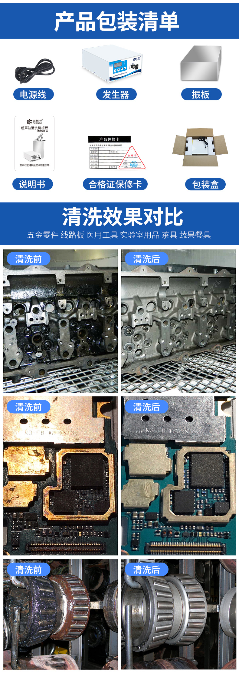 超聲波震板、發生器、發生器電源、說明書、合格證保修卡、內置珍珠泡沫。