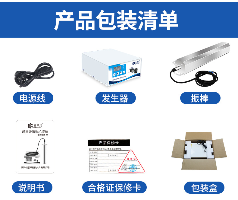 震棒、發生器、發生器電源、說明書、合格證保修卡、內置珍珠泡沫。